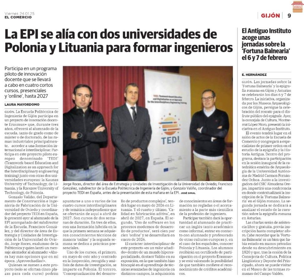 Regional media operating in the region of the University of Oviedo have also echoed the initiative of the TEDI partnership. Through the written press, they have highlighted the project being developed by the Manufacturing Processes Area at the University of Oviedo, aimed at promoting teamwork, digitalization, and interdisciplinary engineering training among three European universities.